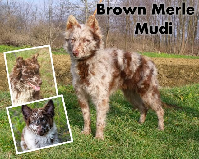 The brown merle Mudi is genetically brown, with a merle pattern. The merle patches can be various shades along the brown colour range, from a pale chestnut to deep liver, with spots anywhere along the spectrum of brown.